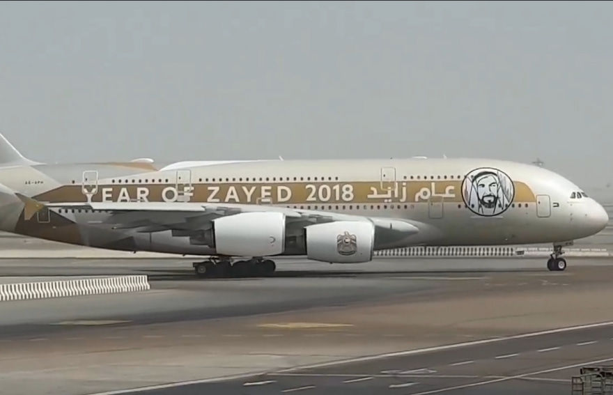 ރާއްޖެއަށް އަންނަ އިއްތިހާދު އެއާވޭސް އެއާބަސް އޭ 861- 380 މަރުކާގެ ބޯޓުގެ ބޭރުގައި ޖަހާފައި ވަނީ "އިޔާ އޮފް ޒައިޑް 2018" އެވެ. އެ ގޮތަށް ޖަހާފައި ވަނީ ޔޫއޭއީގެ ބާނީ ޝެއިޚް ޒައިދު ބިން ސުލްތާން އަލް ނަހުޔާން އުފަންވިތާ މި އަހަރު 100 އަހަރު ފުރޭތީ އެކަން ފާހަގަކުރުމަށެވެ.