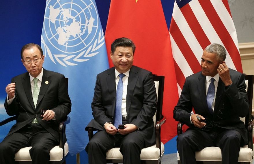 ޕެރިސް އެއްބަސްވުން ތަސްދީގު ކުރުމުން ރައީސް އޮބާމާ އާއި ޗައިނާގެ ރައީސް ޝީ ޖިން ޕިން އަށް ތައުރީފް ކުރައްވާ އދ.ގެ ސެކްރެޓަރީ ޖެނެރަލް ބާން ކީ މޫން ވިދާޅުވީ އެއީ ދުރުވިސްނިވަޑައިގަންނަވާ، ހިތްވަރުގަދަ ދެ ލީޑަރުން ކަމަށެވެ.