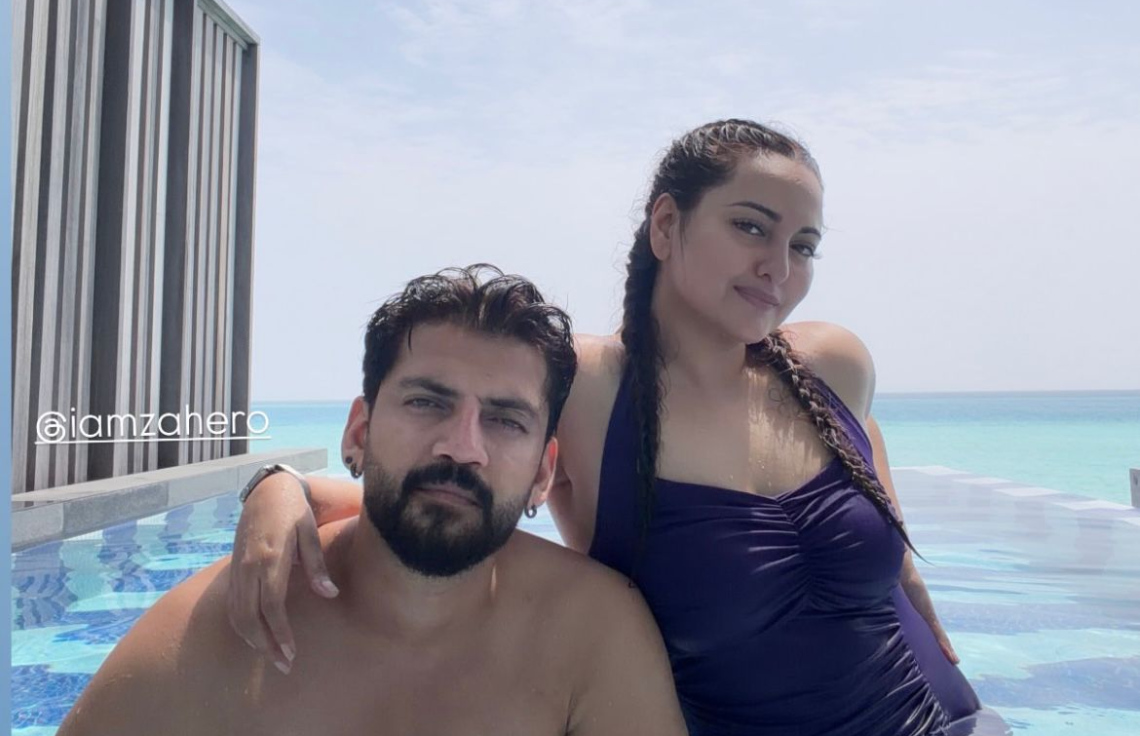 ބޮލީވުޑްގެ އެކްޓްރެސް ސޮނާކްޝީ ސިންހާ އާއި އޭނާގެ ފިރިމީހާ އަދި އެކްޓަރު ޒަހީރް އިގްބާލް ރިސޯޓުގައި އެމީހުން ތިބޭ ވޯޓާ ވިލާގެ ޕޫލުގައި.