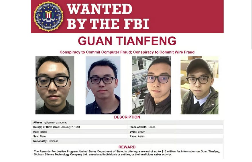 އެމެރިކާގެ ސްޓޭޓް ޑިޕާޓްމަންޓުގެ "ރިވާޑްސް ފޯ ޖަސްޓިސް" ޕްރޮގްރާމުގައި ވާގޮތުން. ތުހުމަތުކުރެވޭ، އުމުރުން 30 އަހަރުގެ ގުއާން ޓިއަންފެންގް ދިރިއުޅެމުން ދަނީ ޗައިނާގެ ސިޗުއާން ޕްރޮވިންސްގަ އެވެ.