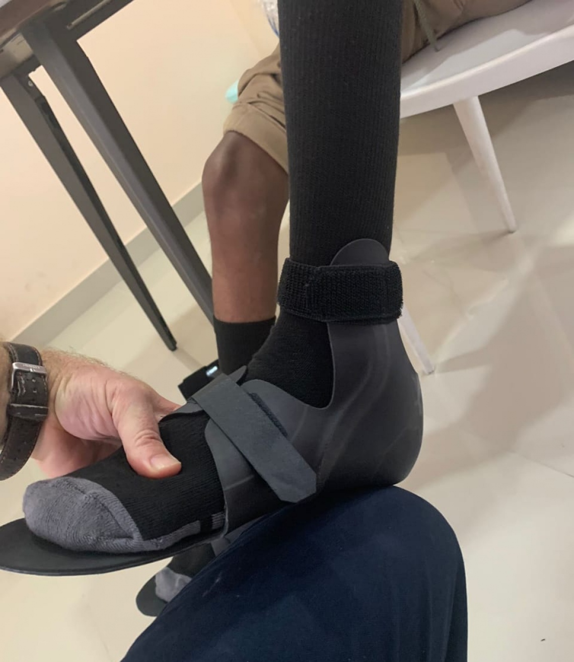 ހަނޫން ހިނގަން ބޭނުންކުރާ އޮތޮޓިކްސް ޑިވައިސް އޭނާގެ ފަޔަށް ލައްވައިފައި.