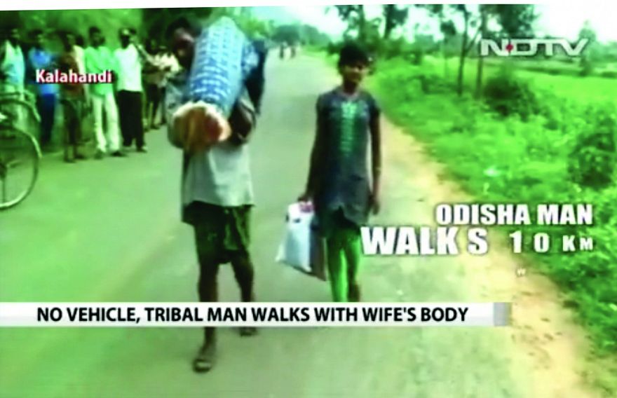 އިންޑިއާގެ އެންމެ ފަގީރު އެއް ޑިސްޓްރިކްޓް ކަމަށްވާ އޮޑިޝާގައި ފިރިހެނަކު އޭނާގެ މަރުވެފައިވާ އަނބިމީހާގެ ހަށިގަނޑު ހޮސްޕިޓަލުން ގެޔަށް ގެންދަން ކޮނޑަށް ލައިގެން 10 ކިލޯމީޓަރަށް ވުރެ ދުރަށް ހިނގައިފި އެވެ. އޭނާއާ އެކު 12 އަހަރުގެ އަންހެންދަރިފުޅު ރޮމުން ހިނގާފައި އަންނަ މަންޒަރު ވެސް ފެނެ އެވެ.