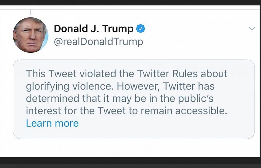 ޓްވިޓާ އިން ޓްރަމްޕުގެ ޓްވީޓް ފޮރުވުމަށް ފަހު ފެންނަ ގޮތަށް ހަދާފައިވާ ނޯޓިސްގައި އޮންނަނީ ޓްވީޓް އާންމުކޮށް ނުފެންނަ ގޮތަށް ހަދާފައިވަނީ ޓްވިޓާގެ އުސޫލުތަކާ ހިލާފުވެފައި ވާތީ އާއި ހަމަނުޖެހުންތަކަށް ހިތްވަރު ދީފައިވާތީ ކަމަށެވެ. ނަމަވެސް ޓްވީޓްގައި އޮތް ވާހަކަ އަކީ ރައްޔިތުންގެ މަސްލަހަތާ ގުޅުން ހުރި ވާހަކައެއް ކަމަށް ވެދާނެތީ، ބޭނުން ނަމަ ޓްވީޓް ބަލައިލެވޭނެ ކަމަށް ބުނެފައިވެ އެވެ.