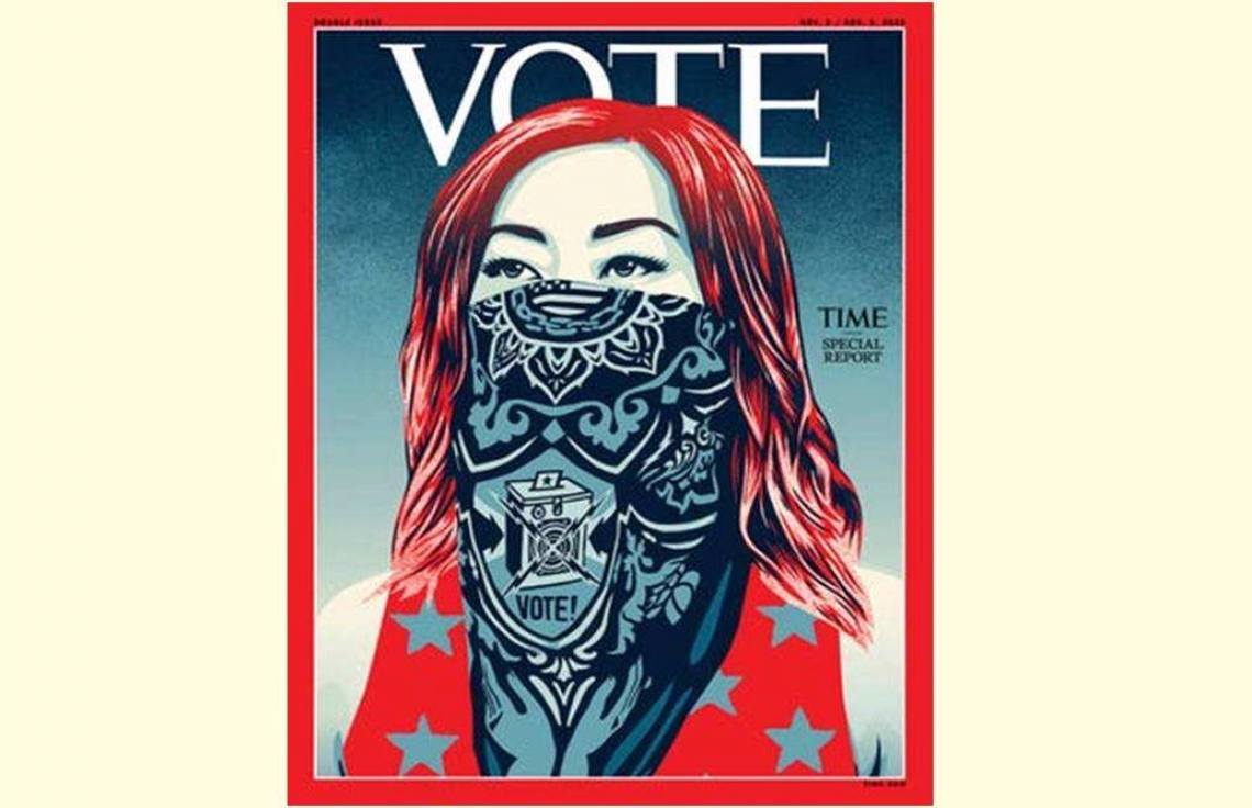 އެމެރިކާގެ ތާރީހުގައި ވެސް ފާހަގަކޮށްލެވޭ އިންތިހާބެއްގެ ގޮތުގައި އަންނަ މަހު ބާއްވާ އިންތިހާބު ފާހަގަކުރެވޭ އިރު އެކަމާ ގުޅުވައިގެން ނެރޭ "ޓައިމް" ގެ ކަވަރުގައި ޖަހާފައި އިނީ "ވޯޓް" ލިޔެފައި އިން ސްކާފެއް އަނގަމަތީގައި އަޅައިގެން އިންނަ އަންހެނެއްގެ ކުރެހުމެކެވެ. އަދި ކަވަރުގެ މައި ސުރުޚީ އަކީ "ޓައިމް ސްޕެޝަލް ރިޕޯޓް" އެވެ.