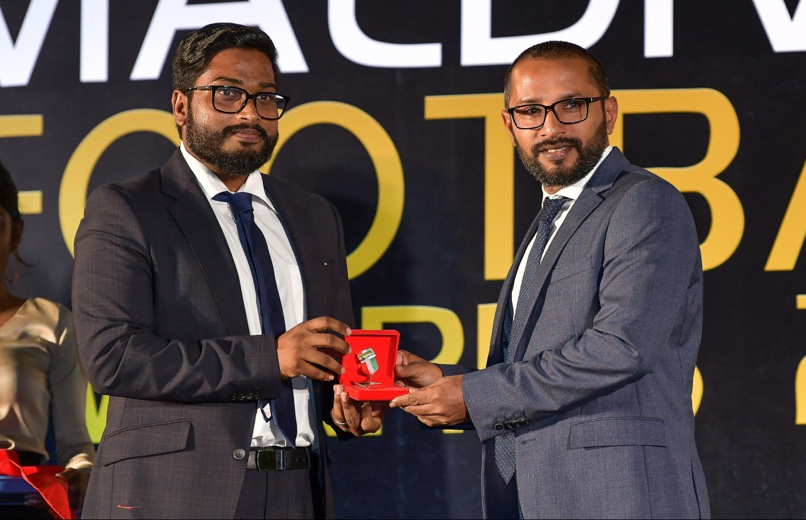 މޯލްޑިވްސް ފުޓްބޯލް އެވޯޑްސް ހަފްލާގެ ތެރެއިން އަލީ އުމަރު (ކ) އާއި އެފްއޭއެމްގެ ރައީސް ބައްސާމް.-- ފޮޓޯ: ނިޝާން އަލީ/ މިހާރު