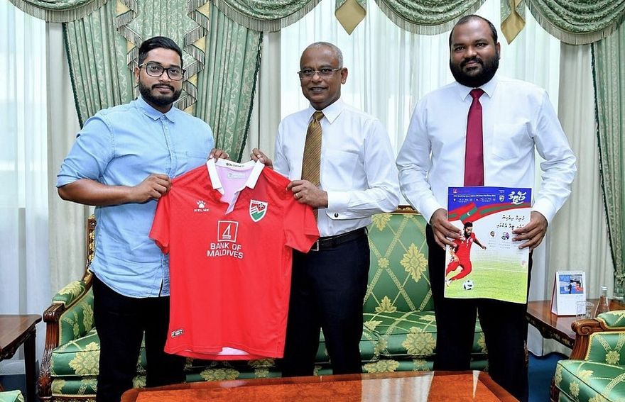 ވޯލްޑް ކަޕާއި އޭޝިއަން ކަޕް ޖޮއިންޓް ކޮލިފައިންގައި މާދަމާ ގަލޮޅު ދަނޑުގައި ފިލިޕީންސާ ދެކޮޅަށް ކުޅޭ މެޗުގެ ކުރިން ގައުމީ ފުޓްބޯޅަ ޓީމުގެ ޖޯޒީއެއް، ރައީސް އިބްރާހިމް މުހައްމަދު ސޯލިހަށް އެފްއޭއެމްގެ ރައީސް ބައްސާމް އަދީލް ޖަލީލާއި ގައުމީ ޓީމު ކޮމިޓީގެ ޗެއާމަން އަދި ޓޫރިޒަމް މިނިސްޓަރު އަލީ ވަހީދު ހަދިޔާކުރައްވައިފި އެވެ.