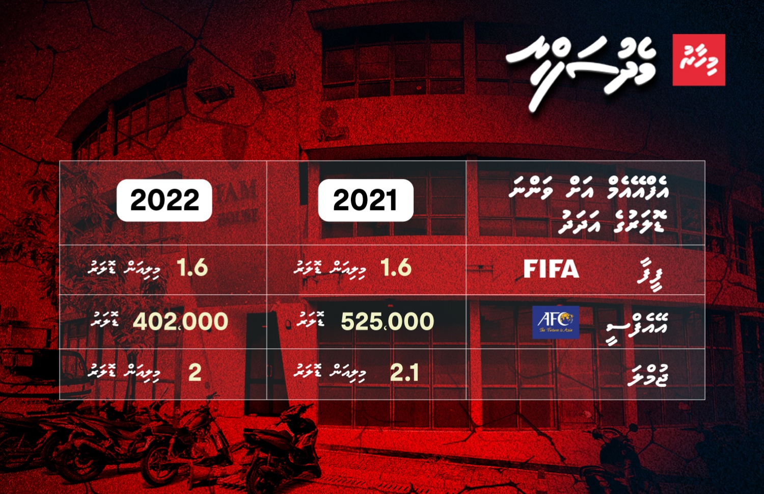 މާލީ ގޮތުން އަޑި އަޅާލާފައި އޮތް ފުޓްބޯލް އެސޯސިއޭޝަން އޮފް މޯލްޑިވްސް (އެފްއޭއެމް) ގެ އާމްދަނީގެ ބޮޑު ބައެއް ވަންނަނީ ޑޮލަރުންނެވެ. ކޮންމެ އަހަރަކު ގާތްގަނޑަކަށް ދެ މިލިއަނެއްހާ ޑޮލަރު އެފްއޭއެމަށް އޭއެފްސީ އާއި ފީފާ މެދުވެރިކޮށް ލިބެ އެވެ.