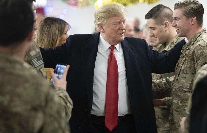ވައިޓް ހައުސް އިން ބުނީ ކުރިން އިއުލާންކޮށްފައި ނުވާ ދަތުރެއްގައި ކްރިސްމަސް ނައިޓްގައި ޓްރަމްޕް އިރާގަށް ވަޑައިގެންނެވީ އެމެރިކާ ސިފައިންނަށް ޝުކުރު އަދާކުރައްވަން ކަމަށެވެ. ޓްރަމްޕް ވިދާޅުވެފައި ވަނީ އިރާގުން އެމެރިކާ ސިފައިން ބޭލުމުގެ ޕްލޭނެއް ނެތް ކަމަށެވެ. ޓްރަމްޕް ދާދި ފަހުން ވަނީ ސީރިއާގައި ތިބޭ އެމެެރިކާ ސިފައިން ބާލަން ނިންމަވައި އަފްޣާނިސްތާނުން 7،000 ސިފައިން އަނބުރާ ގެންދަވަން ނިންމަވައިފަ އެވެ.