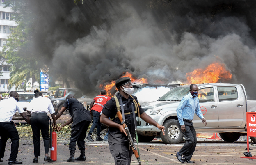 ކަމްޕާލާގެ ފުލުހުން ބުނި ގޮތުގައި އިއްޔެ ހަމަލާ ދިނީ ގާނޫނު ހަދާ މަޖިލީހުގެ އިމާރާތް ކައިރީގަ އާއި އެ ސަހަރުގެ ފުލުހުންގެ މައި މަރުކަޒު ކައިރީގަ އެވެ. އެ ދެ ތަނުގެ ކައިރީގައި ހަމަލާ ދިނީ ހަށިގަނޑުގައި ގޮވާ ތަކެތި ބަނދެގެން ސައިކަލެއްގައި އައި ތިން މީހެކެވެ.