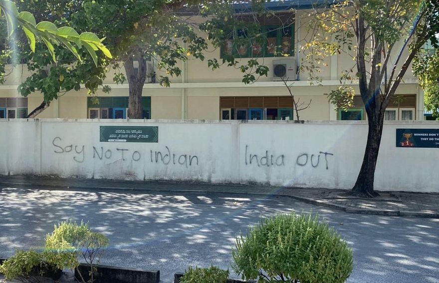 އިންޑިއާ ޓީޗަރުން ވެސް ކިޔަވައިދެމުން އަންނަ ފުނަދޫ ސްކޫލްގެ އުތުރު ފަރާތު ފާރުގައި އިނގިރޭސި ބަހުން "ސޭ ނޯ ޓު އިންޑިއަން" އާއި "އިންޑިއާ އައުޓް" ވަރަށް ބޮޑުކޮށް ލިޔެފައި ވެ އެވެ.