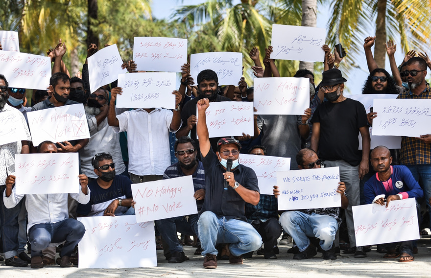 ހުޅުމާލޭގެ ރުއްގަނޑު ދޭއް ސަރަހައްދުގައި ބޭއްވި އެ އިހުތިޖާޖުގައި ވާހަކަ ދެއްކި މީހުން ވަނީ ޓްރާންސްޕޯޓް މިނިސްޓަރު އާއިޝަތު ނަހުލާގެ އިސްތިއުފާ އަށް ގޮވައި، އެ މީހުންގެ ހައްގުތައް ހޯދައި ދިނުމަށް އިލްތިމާސްކޮށްފަ އެވެ.