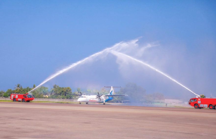 ރަތުމަލަނާ އެއާޕޯޓުން މޯލްޑިވިއަންގެ ފްލައިޓަށް ފެނުގެ ސެލިއުޓާ އެކު މަރުހަބާ ވިދާޅުވީ އެ ގައުމުގެ ޔޫތު އެންޑް ސްޕޯޓްސް މިނިސްޓަރު ނަމަލް ރާޖަޕަކްސް އާއި އޭވިއޭޝަން އެންޑް ޑިވެލޮޕްމަންޓް އޮފް އެކްސްޕޯޓް ޒޯންސްގެ ސްޓޭޓް މިނިސްޓަރު ޑީވީ ޗަނަކަ އާއި އެ ސްޓޭޓްގެ މިނިސްޓަރުންނާއި ރާއްޖޭން ލަންކާއަށް ކަނޑައަޅުއްވާފައި ހުންނަވާ ސަފީރު އުމަރު އަބްދުއް ރައްޒާގެވެ.