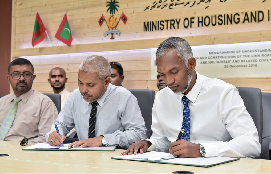ހައުސިން މިނިސްޓްރީގައި މިއަދު މެންދުރުފަހު ބޭއްވި ރަސްމިއްޔާތެއްގައި، އެ ކަމުގެ އެއްބަސްވުމުގައި ސޮއިކުރެއްވީ ހައުސިން މިނިސްޓަރު މުހައްމަދު މުއިއްޒާއި އެޗްޑީސީގެ މެނޭޖިން ޑިރެކްޓަރު މުހައްމަދު ސައިމަން އެވެ.