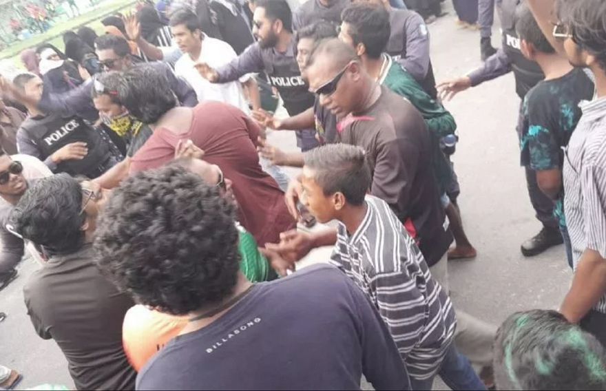 ބައެއް މީހުން ހަޑި ހުތުރުބަހުން އެއްޗެހި ކިޔައި ފުލުހުންގެ ސަފު ފޫއަޅުވާލާފައި ދާން މަސައްކަތް ކުރެ އެވެ. އަދި އަނެއް ކޮޅުގައި ތިބި މީހުންނާ މެދު ހަމަނުޖެހުން ހިންގަން މަސައްކަތް ކުރެ އެވެ.