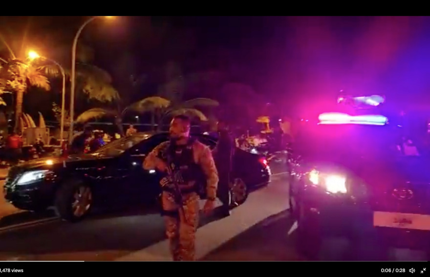 ސޯޝަލް މީޑިއާގައި ދައުރުވާ ވީޑިއޯތަކުން ފެންނަ ގޮތުގައި މުޒާހަރާގެ ބައިވެރިން އެ ތަނުން ދުރަށް ނުދިއުމުން ސިފައިންގެ ސްޕެޝަލް ސެކިއުރިޓީ ފޯސް އިން ހަތިޔާރާއެކު ވެހިކަލްތަކުން ފައިބައި ދުރަށް ދިއުމަށް އެންގި އެވެ. ނަމަވެސް އެ މީހުން ދުރަށް ނުދިއުމުން ރައީސްގެ ބޮޑީގާޑުންނަށް މަޖުބޫރުވީ، އެ މަނިކުފާނުގެ ކާރުކޮޅު އަނބުރާލައި އެހެން މަގަކުން ދާށެވެ.