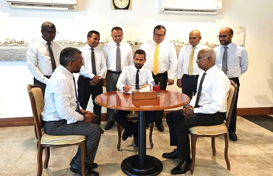 މުލިއާގޭގައި ބޭއްވި ރަސްމިއްޔާތެއްގައި އަލީ ހަމީދު ސޮއިކުރެއްވީ، އެމްޑީޕީގެ އިސް ލީޑަރު ރައީސް އިބްރާހިމް މުހައްމަދު ސޯލިހާއި ޗެއާޕާސަން ފައްޔާޒް އިސްމާއިލްގެ އިތުރުން ޕާޓީގެ ލީޑަޝިޕް ބޭފުޅުންގެ ހާޒިރުގަ އެވެ. އޭނާ ސޮއިކުރެއްވުމާ އެކު ރައްޔިތުންގެ މަޖިލީހުގައި އެމްޑީޕީގެ މެމްބަރުންގެ އަދަދު 68 އަަށް އެރީ އެވެ.