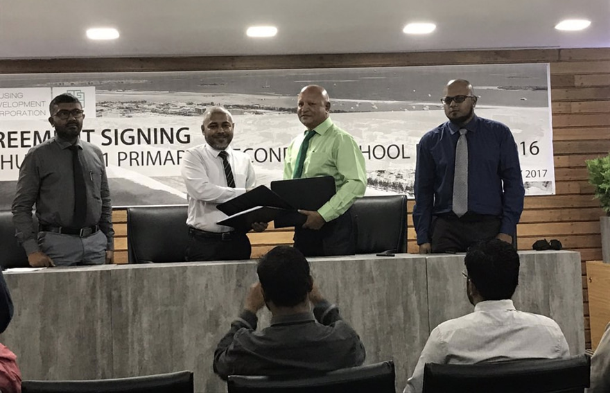 ހައުސިން ޑިވެލޮޕްމަންޓް ކޯޕަރޭޝަން (އެޗްޑީސީ) ގައި ބޭއްވި ރަސްމިއްޔާތެއްގައި "ހުޅުމާލެ އެން 1 ޕްރައިމަރީ އަދި ސެކަންޑްރީ ސްކޫލް" އިމާރާތް ކުރުމުގެ އެއްބަސްވުމުގައި ސޮއި ކުރެއްވީ އެ ކުންފުނީގެ މެނޭޖިން ޑިރެކްޓަރު މުހައްމަދު ސައިމަނެވެ. އަމިންގެ ފަރާތުންް ސޮއިކުރެއްވީ މެނޭޖިން ޑިރެކްޓަރު އަބްދުﷲ މުހައްމަދެވެ.