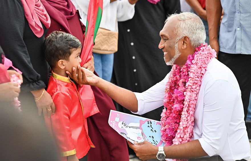 މުއިއްޒުގެ ސަޕޯޓަރުންގެ މި ދިގު ސަފުގެ މެދަކާ ހިސާބުގައި ބޮޑު ސިޓީ އުރައެއް ހިފައިގެން ކުޑަ ފިރިހެން ކުއްޖަކު ހުއްޓެވެ.