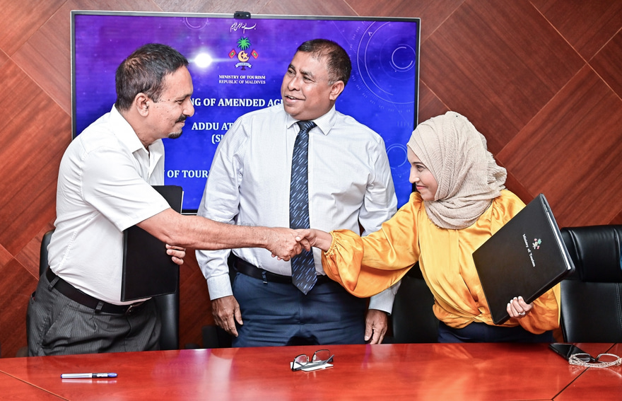 ސަރުކާރުގެ ހިއްސާ އައްޑޫ އިންވެސްޓްމަންޓަށް ދޫކޮށްލުމުގެ އެއްބަސްވުމުގައި ސަރުކާރުގެ ފަރާތުން ސޮއިކުރެއްވީ ޓޫރިޒަމް މިނިސްޓްރީގެ ޕާމަނަންޓް ސެކްރެޓަރީ ފާތިމަތު ނިލްފާ އެވެ. އައްޑޫ އިންވެސްޓްމެންޓް ޕްރައިވެޓް ލިމިޓެޑުން އެ އެއްބަސްވުމުގައި ސޮއިކުރެއްވީ އެ ކުންފުނީގެ ޖެނެރަލް އެފެއާޒް ޑިރެކްޓަރު ސައުދު އަބްދުﷲ އެވެ.