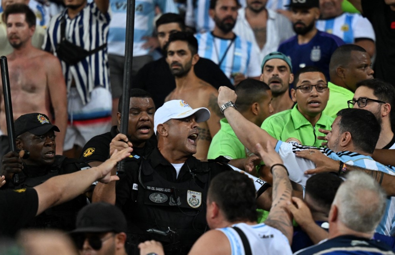 ސަޕޯޓަރުންނާއި ފުލުހުންގެ ކުރިމަތިލައި ހިނގި ހަމަނުޖެހުމުގެ ސަބަބުން މެޗު ފެށުން ބައިގަޑިއިރަށް ލަސްވެގެން ދިޔަ އެވެ. ގައުމީ ސަލާމް ކުޅެމުން ދިޔަ ވަގުތު ބްރެޒިލްގެ ރައްޔިތުންނާއި އާޖެންޓީނާގެ ސަޕޯޓަރުންގެ މެދުގައި ހަމަނުޖެހުންތަކެއް ހިންގަން ފެށުމުން ބްރެޒިލްގެ ފުލުހުން ވަނީ އާޖެންޓީނާގެ ސަޕޯޓަރުން ތިބި ފަޅިއާ ކުރިމަތިލައި ދަނޑިބުރި ބޭނުންކޮށްގެން ހަމަނުޖެހުންތައް މައިތިރިކުރަން މަސައްކަތް ކޮށްފަ އެވެ. އެންމެ ފަހުން ސަޕޯޓަރުން ރައްދު ދިނީ ދަނޑުގައި ހުރި ގޮނޑިތައް އުފުރާލައިގެން ފުލުސް އޮފިސަރުންނާ ދިމާލަށް އުކާފަ އެވެ.