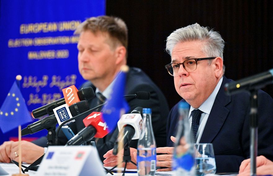 އީޔޫގެ އޮބްޒަވޭޝަން މިޝަންގެ ފައިނަލް ރިޕޯޓު ހާމަކުރުމަށް މިއަދު ބޭއްވި ނޫސްވެރިންގެ ބައްދަލުވުމުގައި އެ މިޝަންގެ ޗީފް އޮބްޒާވަރު އަދި ސްޕެއިންގެ އީޔޫ ޕާލިމަންޓު މެމްބަރު ނާޗޯ ސަންޗޭޒް އަމޯ މައުލޫމާތު ދެއްވަނީ. --ފޮޓޯ: ފަޔާޒް މޫސާ | މިހާރު