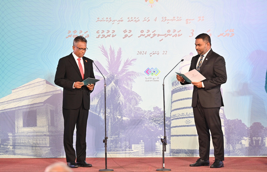 މާލޭގެ މޭޔަރު ހޮވުމަށް ބޭއްވި ބައި-އިލެކްޝަން ކާމިޔާބު ކުރެއްވި އިދިކޮޅު އެމްޑީޕީގެ ކެންޑިޑޭޓް އާދަމް އާޒިމް އާއި ކައުންސިލް މެމްބަރު ކަމަށް އިންތިހާބުވި ތިން ބޭފުޅުން މަގާމުގެ ހުވާ ކުރައްވައިފި އެވެ.