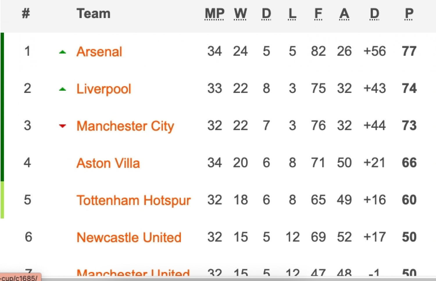 މޮޅާ އެކު އާސެނަލް ވަނީ، ކުރިން އެއްވަނައިގައި އޮތް މެންޗެސްޓާ ސިޓީއާ ޕޮއިންޓްގެ ގޮތުން ފެއަށް ޖެހި އެއްވަނަ މަގާމުގައި ތިން ޕޮއިންޓްގެ ލީޑެއް ނަގައިފަ އެވެ. ދެވަނައިގައި އޮތީ ލިވަޕޫލެވެ. ސިޓީން މެޗު ކުޅެފައި ވަނީ އެ ދެ ޓީމަށް ވުރެ މަދުންނެވެ. އާސެނަލް ވަނީ ސިޓީ އަށް ވުރެ އިތުރަށް ދެ މެޗު ކުޅެފަ އެވެ.