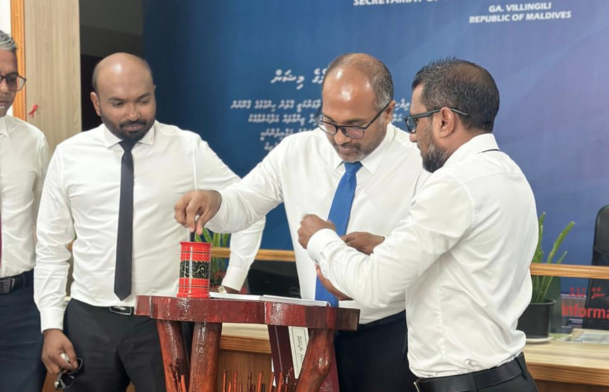 އައިޑީކާޑު ޕްރިންޓްކުރުމުގެ ހިދުމަތް ގއ. ވިލިނގިލީގައި ފެށުމަށް ބޭއްވި ރަސްމިއްޔާތު.-- ފޮޓޯ: ހޯމްލޭންޑް މިނިސްޓްރީ