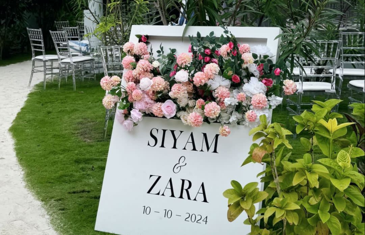 އުމުރުން 55 އަހަރުގެ ސިޔާމް އާއި 23 އަހަރުގެ ޒާރާގެ ކައިވެނީގެ ހަފުލާ މިއަދު ހަވީރު ބޭއްވީ މާލެ އަތޮޅުގައި އޮންނަ ސިޔާމްގެ އޮޅުވެލި ރިސޯޓުގަ އެވެ. އެ ހަފުލާގައި ޒާރާގެ އާއިލާގެ ގިނަ ބަޔަކު ބައިވެރިވި އެވެ.