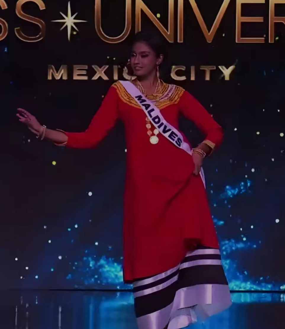 މިސް ޔުނިވާސް މުބާރާތުގައި ވާދަކުރާ ރާއްޖޭގެ މަރިޔަމް ޝައިނާ ނަސީމް ދިވެހި ލިބާހުގެ ރީތިކަން މުޅި ދުނިޔެެއަށް ދައްކާލައިފި އެވެ.