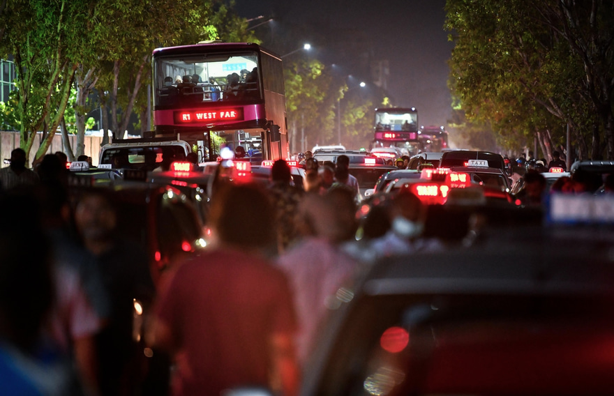 ޓެކްސީ ޑްރައިވަރުން އިހުތިޖާޖުކުރަމުން ދަނީ ހުޅުމާލެއިން ހައިވޭއަށް އަރަން އޮންނަ ހިސާބު ކައިރީގަ އެވެ.