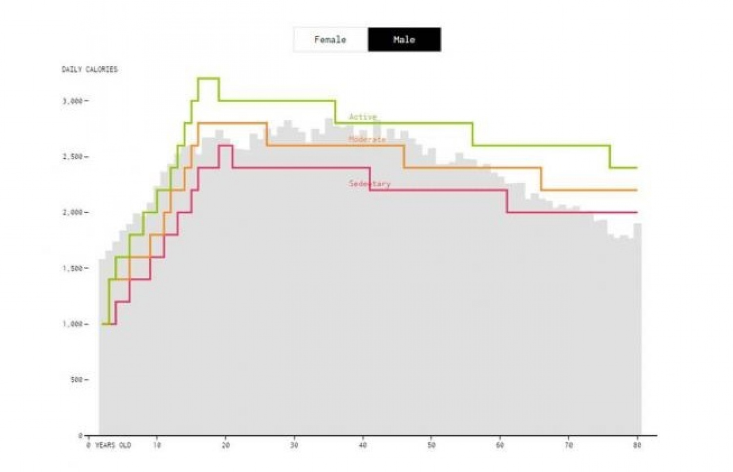 ޔޫސީއެލްއޭގެ ސްޓެޓިސްޓީޝިއަން ނަތަން ޔާއޫ ވަނީ އެމެރިކާގެ ޑިޕާޓްމަންޓް އޮފް ހެލްތު އެންޑް ހިއުމަން ސާވިސްގެ ތަފާސް ހިސާބުތައް ދިރާސާކުރުމަށް ފަހު، އުމުރާ ގުޅޭ ގޮތުން ކެލަރީސް ބޭނުންވާ މިންވަރާ ގުޅޭ ތާވަލެއް އެކުލަވާލައިފަ އެވެ.