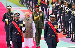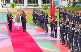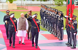 އިންޑިއާގެ ބޮޑުވަޒީރު މޯދީ މިއަދު ހަވީރު ރާއްޖެ އިން ފުރާވަޑައިގަތުމުގެ ކުރިން ސަލާން ކުރައްވަނީ.---ފޮޓޯ: ރައީސް އޮފީސް