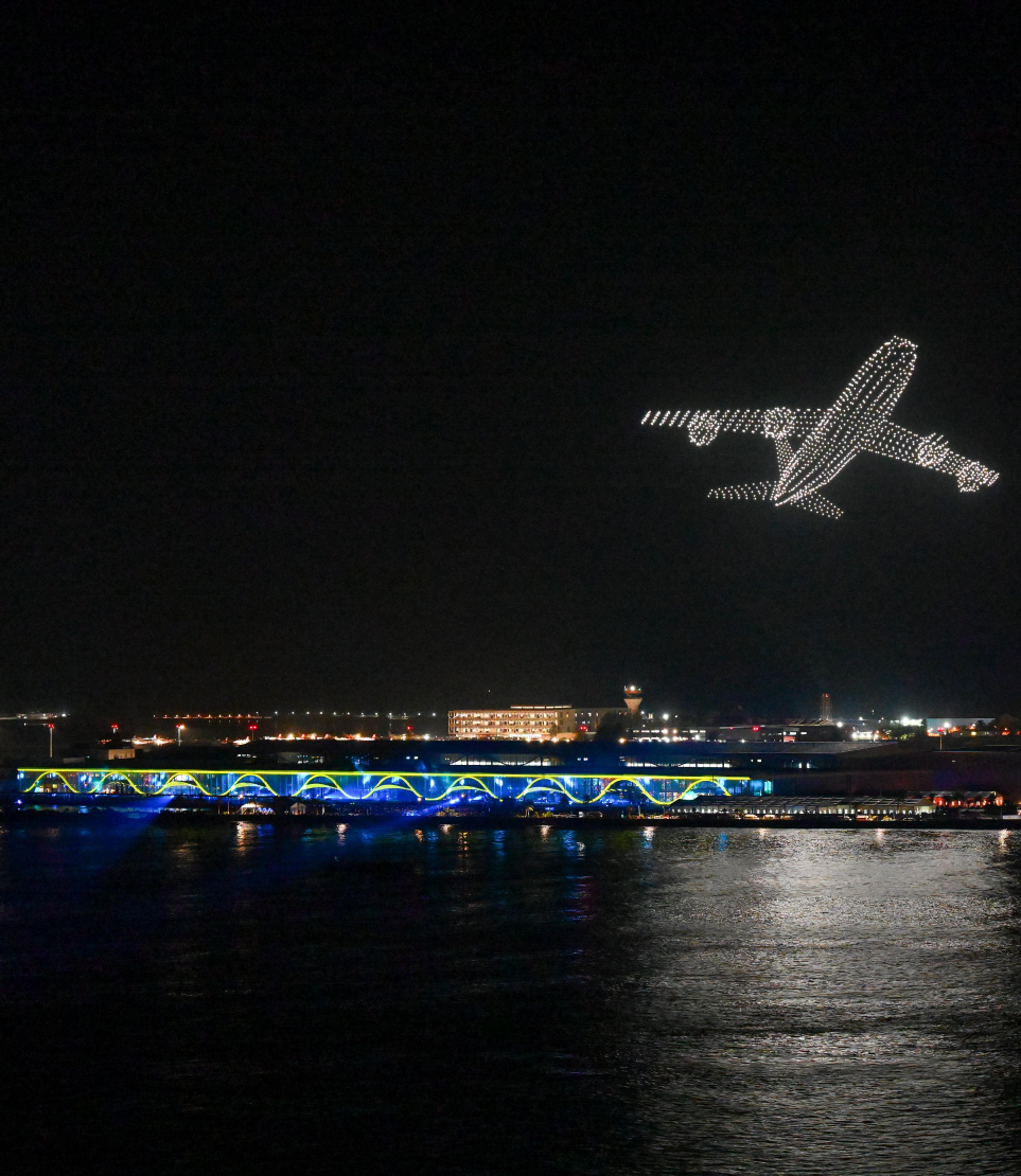 ޑްރޯންތަކުން އެކި ވައްތަރުގެ މަތިންދާބޯޓުތައް ސިފަކޮށްދީ، ވެލާނާ އެއާޕޯޓުގެ ދިގު ތާރީހު ދައްކަމުން ދިޔައިރު މުޅި ޓާމިނަލް އެކި ކުލަތަކުން ދިއްލެމުން އަދި ޑްރޯން ޝޯއާ ގުޅޭ މިއުޒިކުން އިތުރަށް ފުރިހަމަކޮށްލި އެވެ.