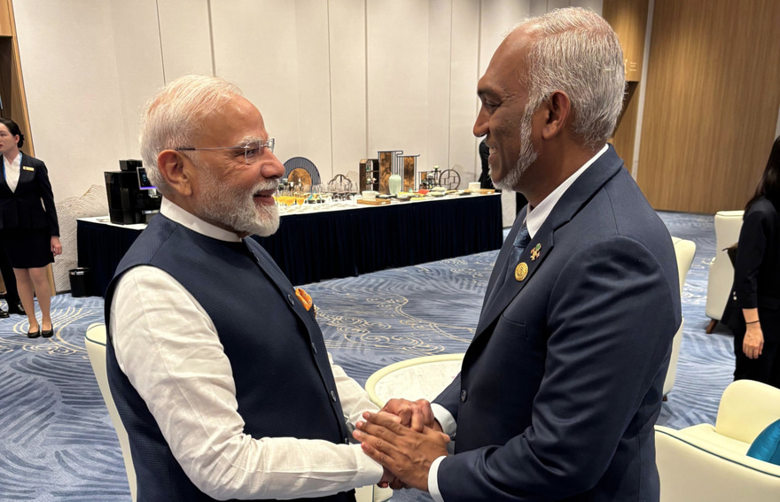 ޝަންހާއީ ކޯޕަރޭޝަން އޯގަނައިޒޭޝަން (އެސްސީއޯ) ސަމިޓުގައި ބައިވެރިވެވަޑައިގަތުމަށް ޗައިނާއަށް ރައީސް ޑރ. މުހައްމަދު މުއިއްޒު ކުރައްވާ ދަތުރުފުޅުގެ ތެރެއިން އިންޑިއާގެ ބޮޑުވަޒީރު ނަރެންދުރަ މޯދީއާ ބައްދަލު ކުރައްވައިފި އެވެ.