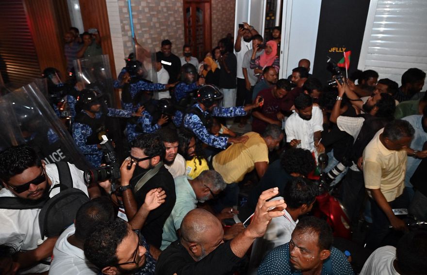 ނަމަވެސް، އެކަމަށް އިޖާބަނުދީ އެއްވުމުގެ ބައިވެރިން ފުލުހުންނާ ދިމާލަށް ގަލާއި ފެންފުޅި އުކައި ފުލުހުންގެ އާލަތްތައް އަތުލަން މަސައްކަތްކޮށް އަދި ފުލުހުންގެ ވާޖިބަށް ހުރަސްއަޅާފައިވާ ކަމަށް ބުންޏެވެ.