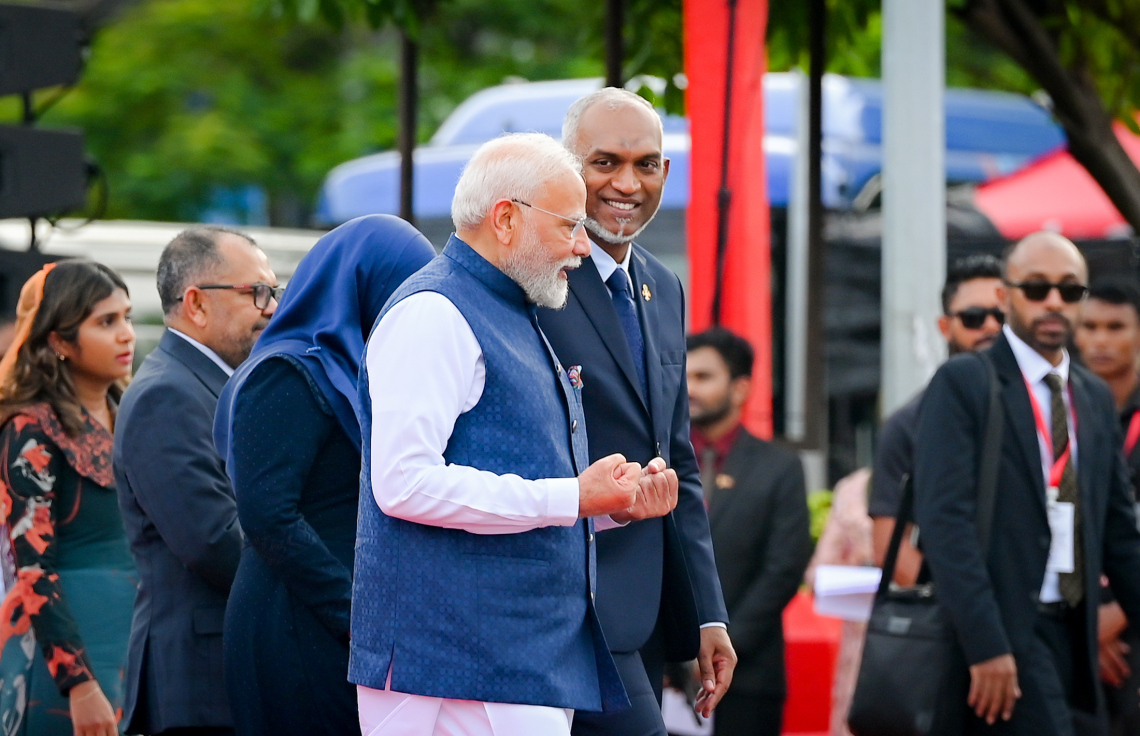 އިންޑިއާގެ ބޮޑުވަޒީރު ނަރެންދުރާ މޯދީ ރާއްޖެއަށް ކުރެއްވި ދަތުުރުގައި ރައީސް ޑރ.،މުހައްމަދު މުއިއްޒު އޭނާއަށް މަރުހަބާ ވިދާޅުވަނީ. ފޮޓޯ: ރައީސް އޮފީސް