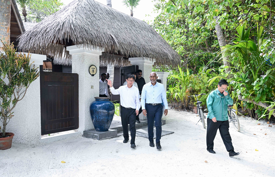 ރައީސް މުއިއްޒު އިއްޔެ ޝަންގްރިއްލާ ރިސޯޓަށް ވަޑައިގެން، އަންނަ މަހުގެ ނިޔަލަށް އެ ރިސޯޓު އަލުން ހުޅުވުމުގެ އެންމެ ފަހުގެ ތައްޔާރީތައް ބައްލަވަނީ.---ފޮޓޯ: ރައީސް އޮފީސް