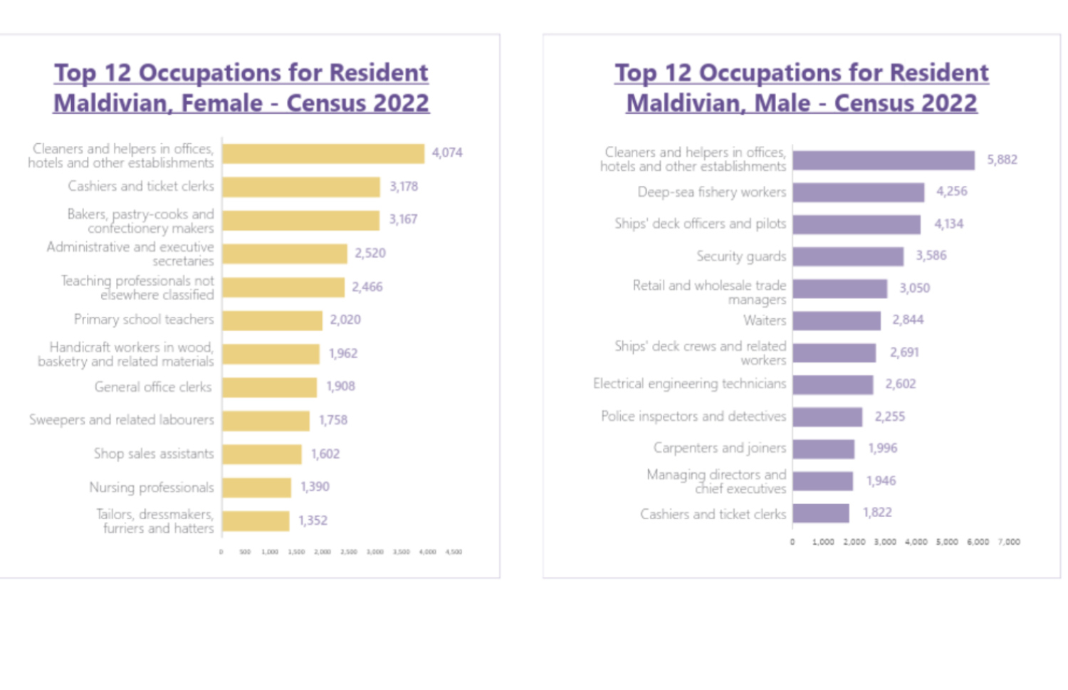 މުޅި ރާއްޖޭގެ ދިވެހި މަސައްކަތްތެރިންގެ އާބާދީ އަށް ބަލާ ނަމަ ފެންނަން އޮތީ ވަރަށް ހިތްދަތި މަންޒަރެކެވެ. އެންމެ ފަހުން 2022 ވަނަ އަހަރު ބޯހިމެނުމުގެ ނަތީޖާ ދައްކާ ގޮތުން ދިވެހިންގެ ތެރޭގައި އެންމެ ގިނަ ބަޔަކު ވަޒީފާ އަދާކުރަނީ ފޮޅާ ސާފުކުރުމާއި އޮފީސްތަކުގެ އެހީތެރިންގެ މަސައްކަތްތަކުގަ އެވެ. މިގޮތުން، 5،882 ފިރިހެނުން މި ދާއިރާގައި އުޅޭއިރު 4،074 އަންހެނުން މި ދާއިރާގައި މަސައްކަތް ކުރެ އެވެ.