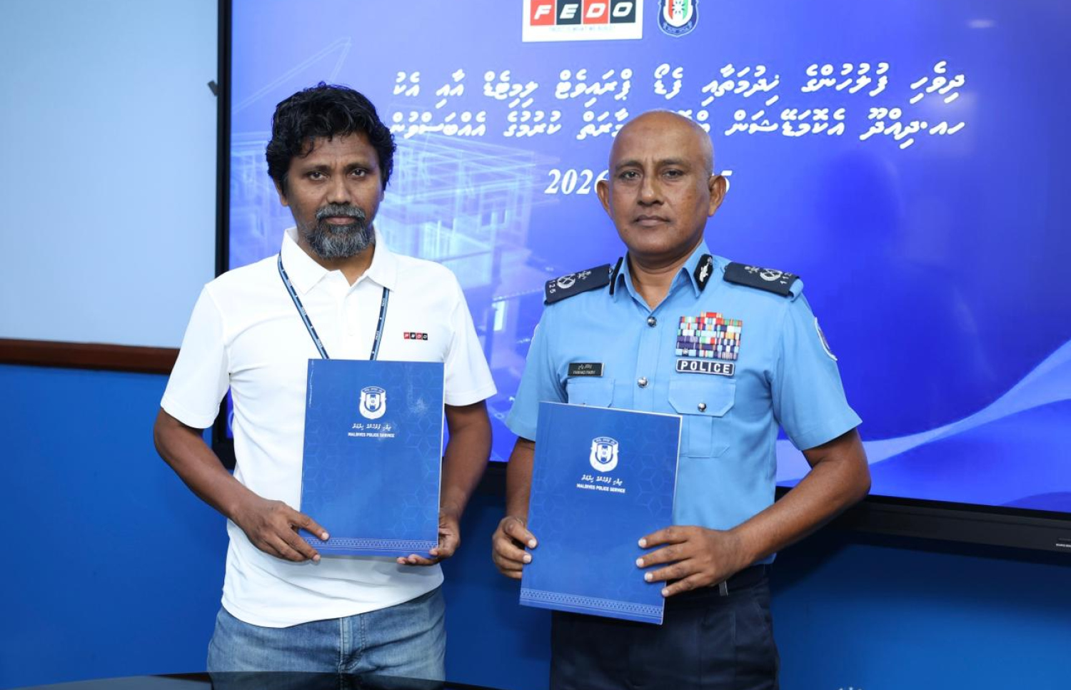ޝަހީދު ހުސައިން އާދަމް ބިލްޑިންގައި ބޭއްވި ހާއްސަ ރަސްމިއްޔާތެއްގައި ފުލުހުންގެ ފަރާތުން އެއްބަސްވުމުގައި ސޮއިކުރެއްވީ ޑެޕިއުޓީ ކޮމިޝަނާ އޮފް ޕޮލިސް ފަރުހާދު ފިކުރީ އެވެ.