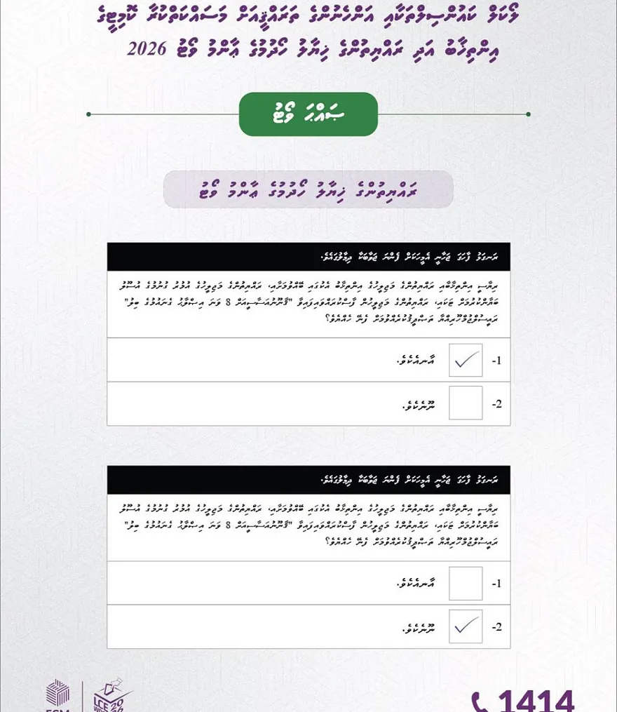ރާއްޖޭގެ މައި ދެ އިންތިހާބު އެއް ދުވަހެއްގައި ބޭއްވުމާ މެދު ގޮތެއް ނިންމަން ބާއްވާ ފެންނަ ނުފެންނަ ވޯޓުގައި ކުރާ ސުވާލަކީ "ރިޔާސީ އިންތިހާބާއި ރައްޔިތުންގެ މަޖިލިހުގެ އިންތިހާބު އެކުގައި ބޭއްވުމަށާއި، ރައްޔިތުންގެ މަޖިލިހުގެ އުމުރު ގުނުމުގެ އުސޫލު ބަޔާންކުރުމަށްޓަކައި، ރައްޔިތުންގެ މަޖިލިހުން ފާސްކުރައްވާފައިވާ 'ގާނޫނުއަސާސީ އަށް 8 ވަނަ އިސްލާހު ގެނައުމުގެ ބިލް' ރައީސުލްޖުމްހޫރިއްޔާ ތަސްދީގު ކުރެއްވުމަށް ފެނޭ ހެއްޔެވެ؟" މި އެވެ.