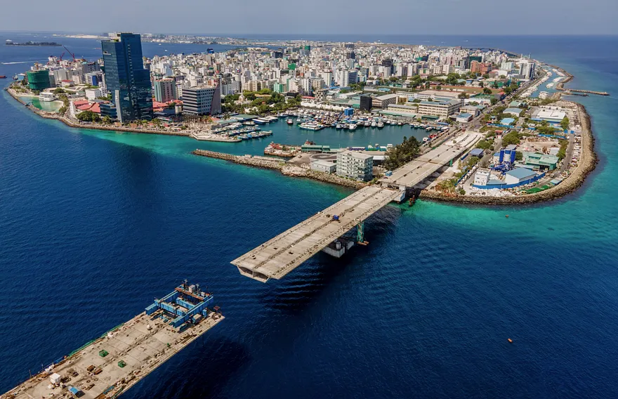 އިންޑިއާ ސަރުކާރުގެ އެހީގައި، އެ ގައުމުގެ އެފްކޮންސް ކުންފުނިން ހަދަމުން އަންނަ 6.7 ކިލޯމީޓަރުގެ މި ދިގު ބްރިޖުގެ 60 ޕަސެންޓް މަސައްކަތް މިހާރު ވަނީ ނިމިފަ އެވެ. އެ ބްރިޖު އެޅުމަށް މޫދުގެ އަޑީގައި ކުރަން ޖެހޭ ހުރިހާ މަަސައްކަތެއް މިހާރު ވަނީ ނިމިފަ އެވެ.