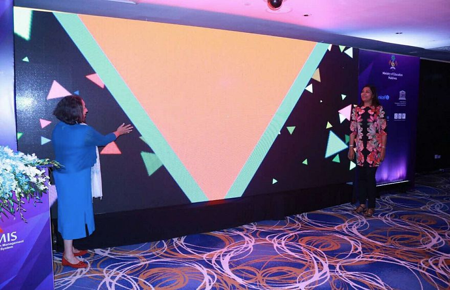 ހޮޓެލް ޖެންގައި ބޭއްވި ރަސްމިއްޔާތެއްގައި، ޔުނިސެފްގެ އެހީތެރިކަމާއެކު ތައާރަފުކުރި މޯލްޑިވްސް އެޑިއުކޭޝަން މެނޭޖްމަންޓް އިންފޮމޭޝަން ސިސްޓަމް (މީމިސް) ލޯންޗުކޮށްދެއްވީ އެޑިއުކޭޝަން މިނިސްޓަރު ޑރ. އާއިޝަތު ޝިހާމް އަދި ޔުނިސެފްް ރީޖަނަލް ޑައިރެކްޓާ ޑރ. ޖީން ގޯފެވެ.