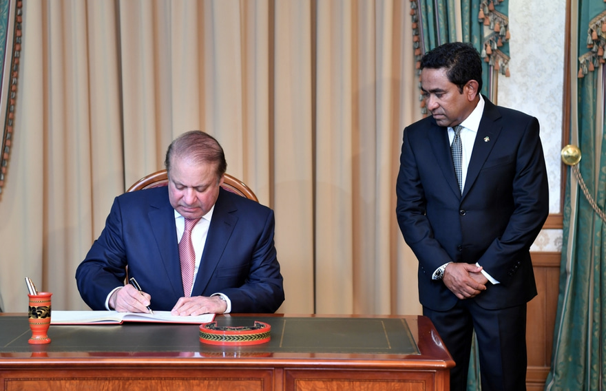 މިއަދު ހަވީރު ރައީސް އޮފީހުގައި ބޭއްވި މި ރަސްމިއްޔާތުގައި، ރައީސް އަބްދުﷲ ޔާމީނާއި ޕާކިސްތާނުގެ ބޮޑުވަޒީރު މުހައްމަދު ނަވާޒު ޝަރީފް ވެސް ބައިވެރިވެވަޑައިގެންނެވި އެވެ.