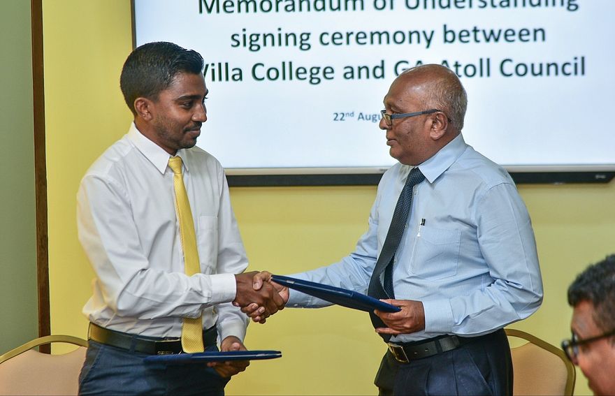 އެ އަތޮޅުގެ ދަރިވަރުންނަށް ހާއްސަކޮށްގެން ފަށާ މި ކޯސްތައް ކުރިއަށްގެންދިއުމުގެ އެއްބަސްވުމުގައި ވިލާ ކޮލެޖުގެ ރެކްޓާ ޑރ. އަހުމަދު އަންވަރު އަދި ގއ. އަތޮޅު ކައުންސިލްގެ ރައީސް އަހުމަދު ފުއާދު ވަނީ މިއަދު ސޮއިކުރައްވައިފަ އެވެ.