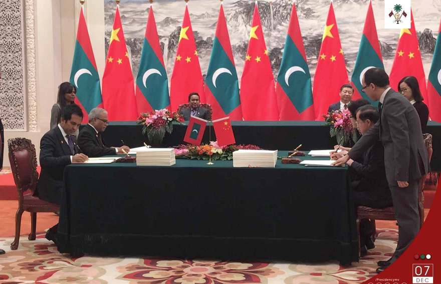 ރައީސް އަބްދުﷲ ޔާމީން މިހާރު ޗައިނާ އަށް ކުރައްވަމުން ގެންދަވާ ދަތުރުފުޅުގައި، ފްރީ ޓްރޭޑް އެގްރީމެންޓް (އެފްޓީއޭ) ގައި ރާއްޖޭގެ ފަރާތުން ސޮއިކުރެއްވީ އިކޮނޮމިކް މިނިސްޓަރު މުހައްމަދު ސައީދެވެ. ޗައިނާ ސަރުކާރުގެ ފަރާތުން ސޮއިކުރެއްވީ ކޮމާސް މިނިސްޓަރެވެ.