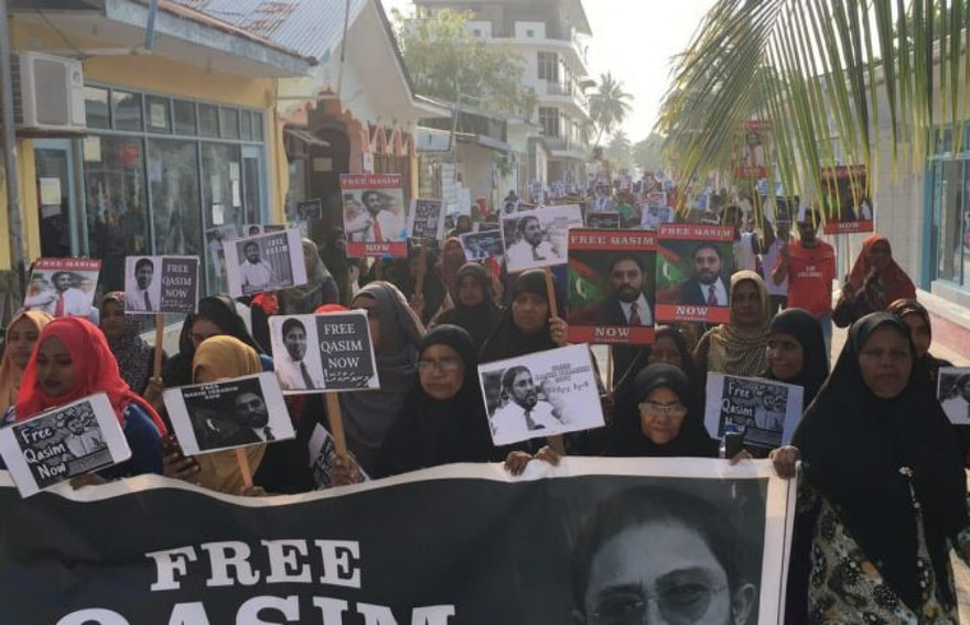 ގާސިމްގެ ފޮޓޯ އާއި އޭނާއަށް ހެޔޮއެދޭ ކަން އަންގައިދޭ ލިޔުންތަކާއި އަދި ސަރުކާރާ ދެކޮޅު ޝުއޫރުތައް ހިމެނޭ ލިޔުންތަކާއެކު ކުރާ މުޒާހަރާގައި މާމިގިލީގެ ކުދިބޮޑު އެންމެން ބައިވެރިވެ އެވެ.