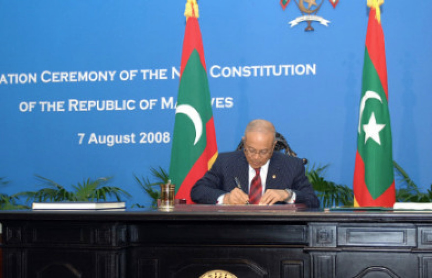 އާ ގާނޫނުއަސާސީ ހަދަން، އާ ހާއްސަ މަޖިލިހެއް ހޮވައި އެ ފެށި ބުރަ މަސައްކަތަށް، ވެރިކަން ހިންގަން ތިބި މީހުންނާއި އެ މީހުންނަށް ޕްރެޝަރުކުރަން އިދިކޮޅުގައި ހަރަކާތްތެރިވި މީހުންގެ ހިޔާލު އެއްގޮތްނުކުރެވި އެތައް ދުވަހެއް ހޭދަވި އެވެ. އެކަމަކު އާ ރިޔާސީ އިންތިހާބަކަށް ގައުމު ނުކުތުމުގެ ކުރިން އާ ގާނޫނުއަސާސީ ނިންމައި، ހާއްސަ ދަރުބާރުގެއެއްގައި، ބޮޑު ރަސްމިއްޔާތެއްގައި ރައީސް މައުމޫން އެ ތަސްދީގުކުރެއްވި އެވެ.