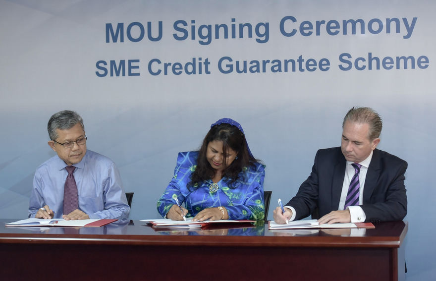 މަރުކަޒީ ބޭންކުގައި ބޭއްވި ރަސްމިއްޔާތެއްގައި ކްރެޑިޓް ގެރެންޓީ ސްކީމްގައި ބައިވެރިވުމުގެ އެއްބަސްވުމުގައި އެމްއެމްއޭގެ ފަރާތުން ސޮއިކުރެއްވީ ގަވަރުނަރު ޑރ. އަޒީމާ އާދަމް އެވެ. ބީއެމްއެލްގެ ފަރާތުން ސޮއިކުރެއްވީ ސީއީއޯ އެންޑްރޫ ހީލީ އެވެ. އެމްއައިބީގެ ފަރާތުން ސޮއިކުރެއްވީ މެނޭޖިން ޑިރެކްޓަރު ހަރީސް ހާރޫން އެވެ.