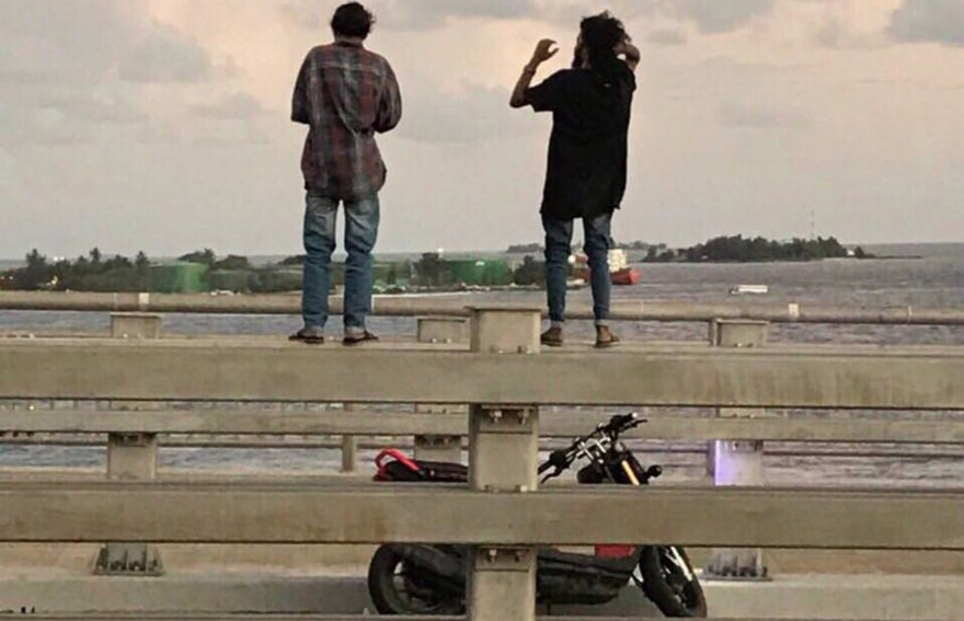 ސޯޝަލް މީޑިއާގައި ވައިރަލްވެފައިވާ އެއް މަންޒަރެވެ؛ ބްރިޖުގެ މެދެއްހާ ހިސާބުގައި ސައިކަލު ޕާކުކޮށްފައި ދެ މީހަކު އަރައި ތިބެނީ، ބްރިޖުގައި ހިނގާ ލޭން ވަކިކުރަން ޖަހާފައި ހުރި ޗެންޗޭނު ގަނޑުގެ މައްޗަށެވެ. އެ މީހުންގެ ހާސްކަމެއް ނެތަސް އެ މަންޒަރުގެ ފެނުނު މީހުންގެ ގައިން ހީބިހި ނަގައިގެންދެ އެވެ.